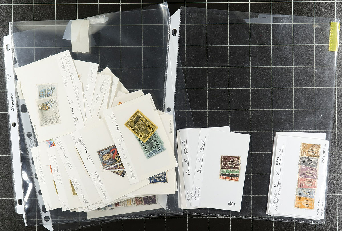 Stock of primarily used Portugal, 1850's-1970's, containing a few thousand stamps in over 40 manila stock pages and in several 102 cards. A spot check indicates a small selection of early issues with the majority of material ranging from the late 19th century up to the 1940's, with a few items cataloguing in the $5 to $10 range, leaving better finds to the dedicated collector, including town postmarks. Overall fine to very fine. Estimate =