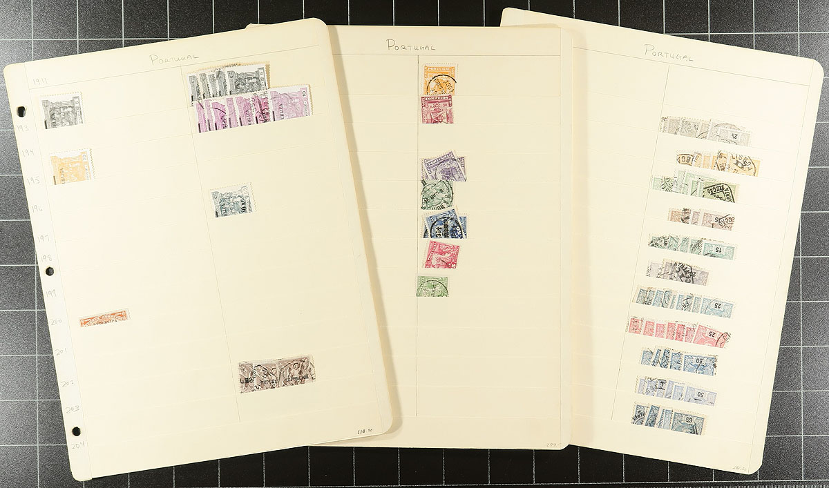 Stock of primarily used Portugal, 1850's-1970's, containing a few thousand stamps in over 40 manila stock pages and in several 102 cards. A spot check indicates a small selection of early issues with the majority of material ranging from the late 19th century up to the 1940's, with a few items cataloguing in the $5 to $10 range, leaving better finds to the dedicated collector, including town postmarks. Overall fine to very fine. Estimate =