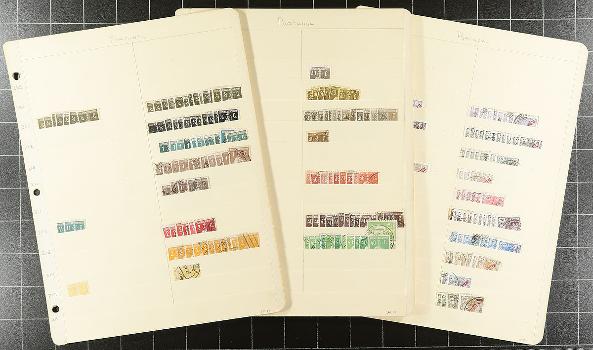 Stock of primarily used Portugal, 1850's-1970's, containing a few thousand stamps in over 40 manila stock pages and in several 102 cards. A spot check indicates a small selection of early issues with the majority of material ranging from the late 19th century up to the 1940's, with a few items cataloguing in the $5 to $10 range, leaving better finds to the dedicated collector, including town postmarks. Overall fine to very fine. Estimate =
