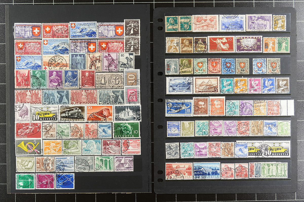 Lovely group of used Switzerland, 1880's-1950's, containing roughly 550 stamps (many with "socked on the nose" town cancels), in a handful of stock or album pages. The group generally ranges from Scott #41/343, along with a few back of the book issues, noting some singles, sets, and partial sets, cataloguing $10 and up. Postmark interest everywhere, with many easily readable and fully dated. A nice lot for the Switzerland or worldwide postmark collector. All pages photographed, overall fine to very fine. Owner's old 2010 Scott US$1,170.00 =