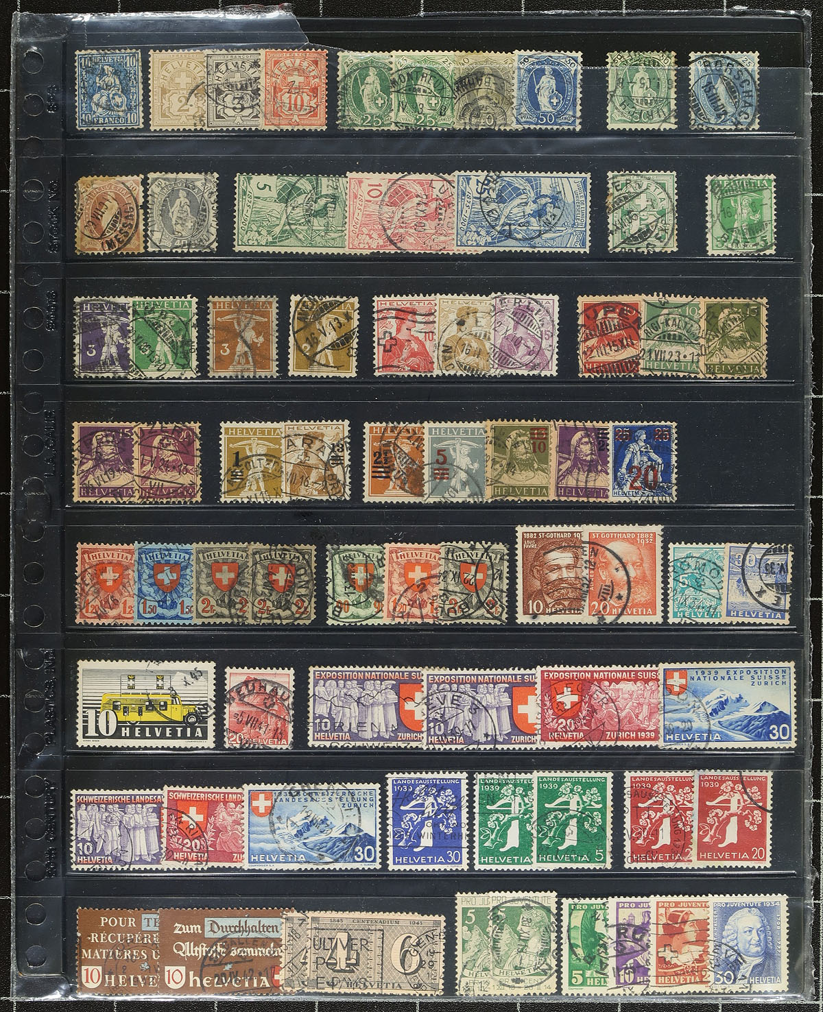 Collection / accumulation of used Switzerland, 1855-2002, containing roughly 1,700 stamps in roughly 20 stock pages. The lot ranges from Scott #29/1276, including back of the book issues, including #s 29, 37, 70, 86a, 96, 146, 201-203, and several other issues cataloguing $10 and up. Lots of potential finds for the dedicated collector. Postmark interest with many "socked on the nose" town cancels. A few faults on a few of the early issues, overall fine to very fine. Owner's older 2015 Scott US$1,778.00 =