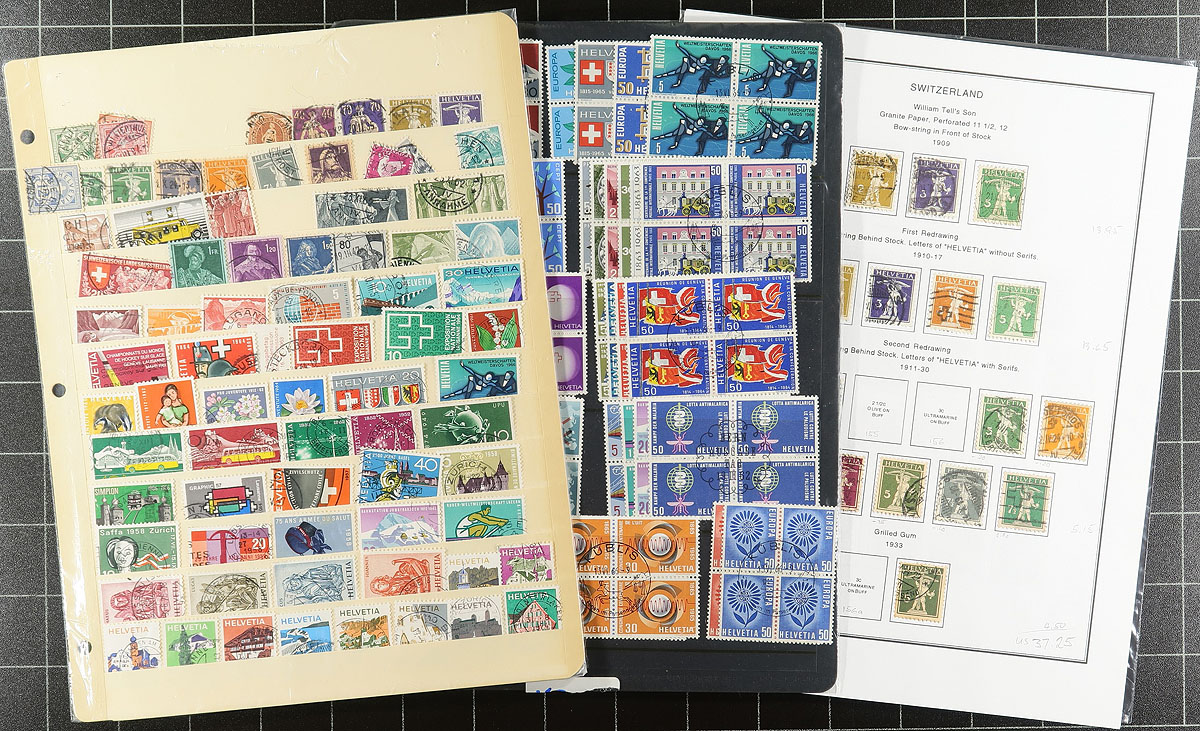 Collection / accumulation of used Switzerland, 1855-2002, containing roughly 1,700 stamps in roughly 20 stock pages. The lot ranges from Scott #29/1276, including back of the book issues, including #s 29, 37, 70, 86a, 96, 146, 201-203, and several other issues cataloguing $10 and up. Lots of potential finds for the dedicated collector. Postmark interest with many "socked on the nose" town cancels. A few faults on a few of the early issues, overall fine to very fine. Owner's older 2015 Scott US$1,778.00 =