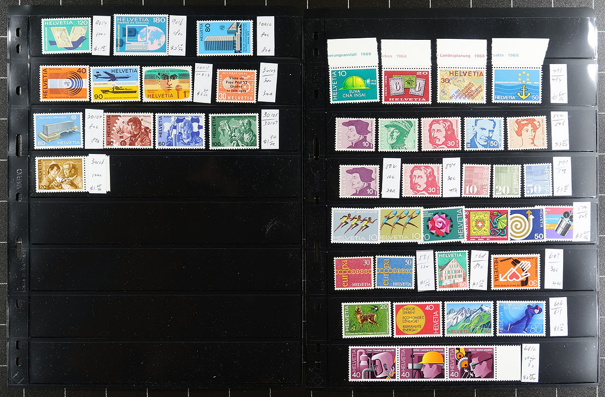 Nice group of primarily never hinged Switzerland, 1880's-2005, containing roughly 650 stamps in a handful of stock pages. The lot contains a wide variety of items, generally ranging from Scott #60/1193, including several semi-postal sets, some souvenir sheets, coils, plate blocks, a few year sets, and more. We note a few items cataloguing in the $10 to $20 range. A nice clean lot for all collectors. Owner's older Scott (unknown year) US$1,076.00 =