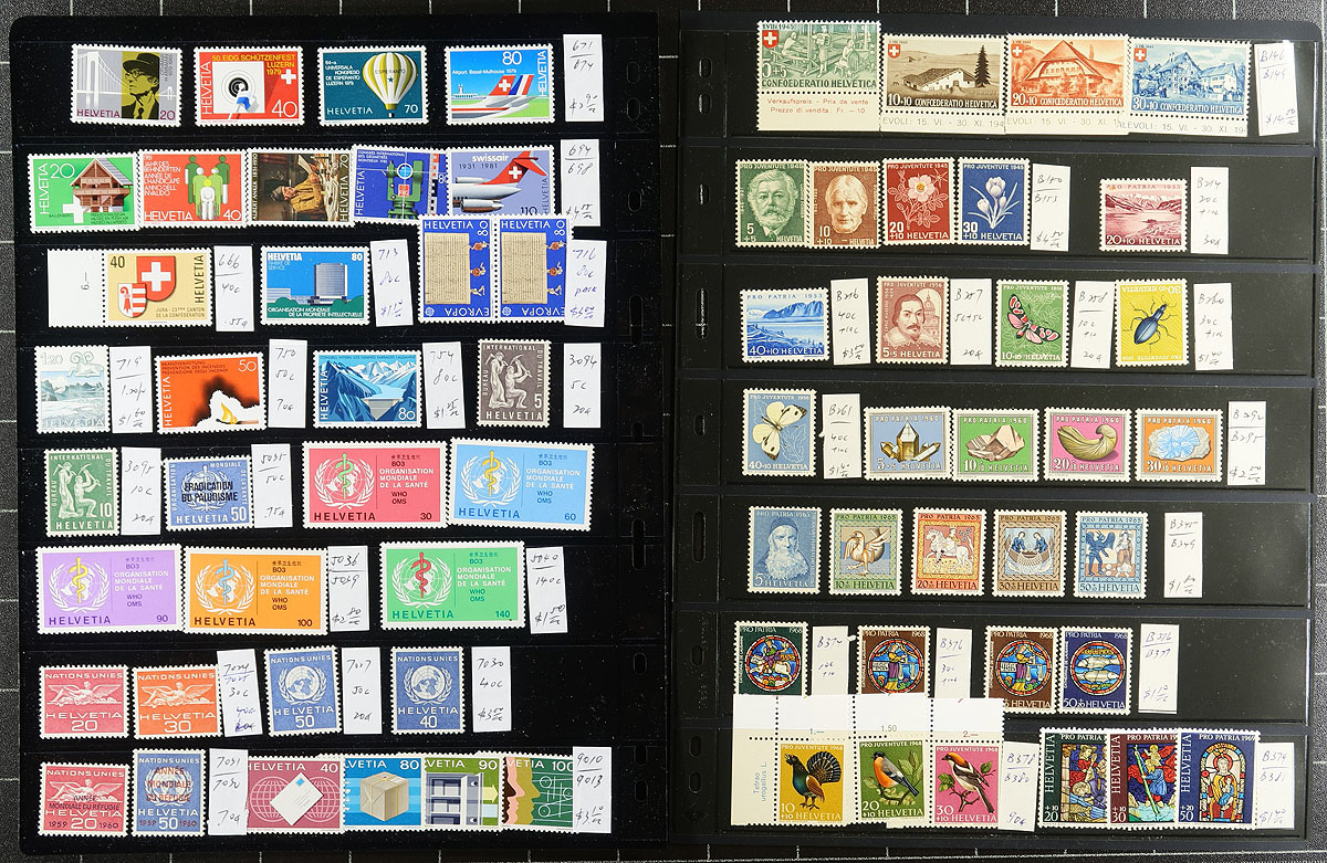 Nice group of primarily never hinged Switzerland, 1880's-2005, containing roughly 650 stamps in a handful of stock pages. The lot contains a wide variety of items, generally ranging from Scott #60/1193, including several semi-postal sets, some souvenir sheets, coils, plate blocks, a few year sets, and more. We note a few items cataloguing in the $10 to $20 range. A nice clean lot for all collectors. Owner's older Scott (unknown year) US$1,076.00 =