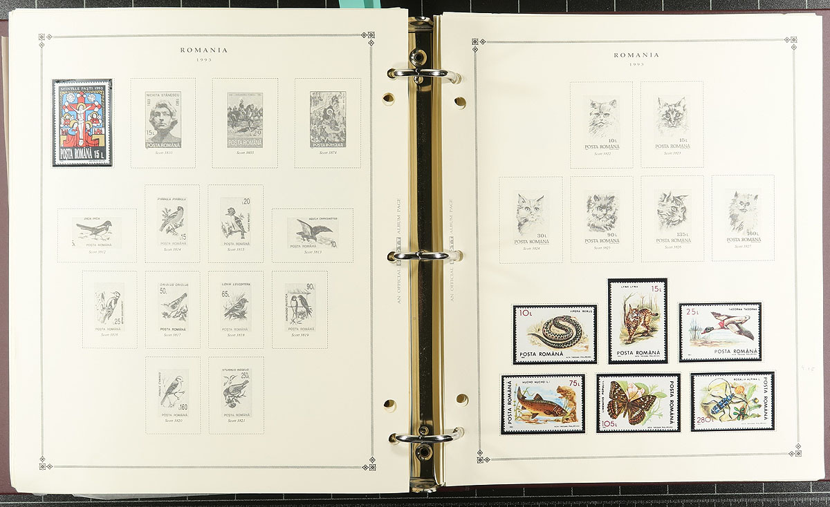 Collection of mint and used Romania, 1865-1994, containing over 1,000 stamps in over 100 album pages in a Uni-Safe binder with slipcase. The collection generally ranges from Scott #24/3893, along with selections of semi-postals and airmail issues. A spot check indicated a fairly even mixture of mint and used material, primarily from the 1900's to the 1980's, with some sets and souvenir sheets cataloguing $10 and up each. A nice collection that should be expanded further, overall fine to very fine. Estimate =