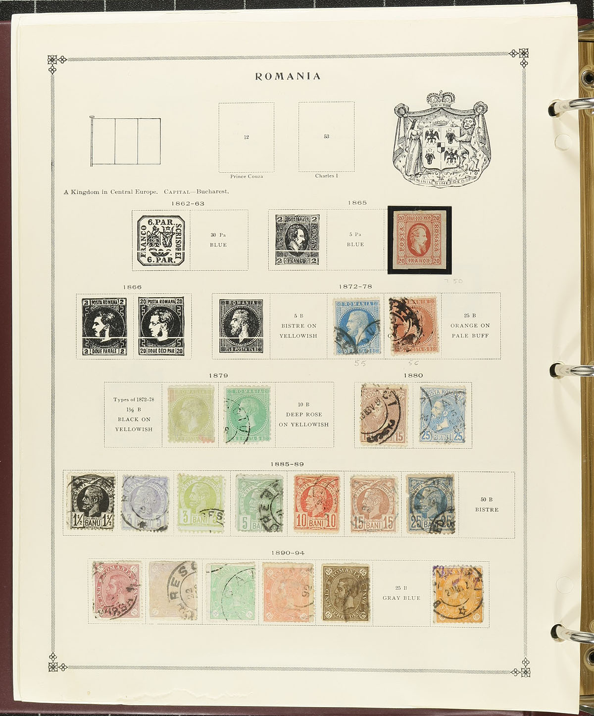 Collection of mint and used Romania, 1865-1994, containing over 1,000 stamps in over 100 album pages in a Uni-Safe binder with slipcase. The collection generally ranges from Scott #24/3893, along with selections of semi-postals and airmail issues. A spot check indicated a fairly even mixture of mint and used material, primarily from the 1900's to the 1980's, with some sets and souvenir sheets cataloguing $10 and up each. A nice collection that should be expanded further, overall fine to very fine. Estimate =