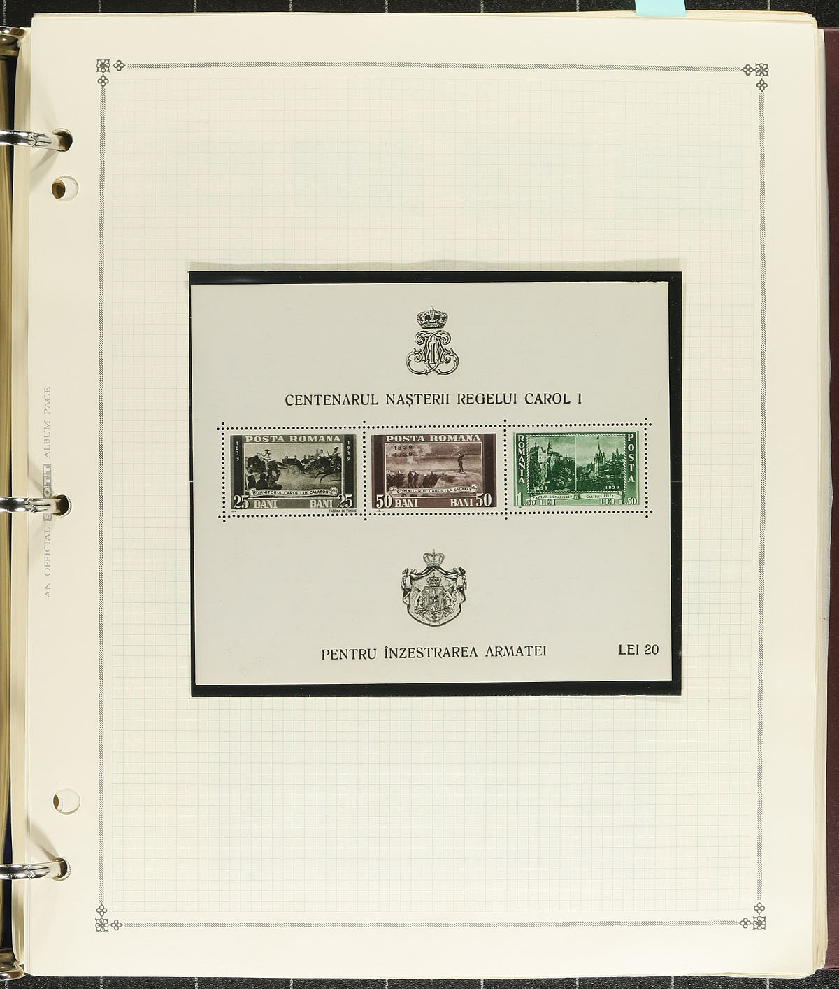 Collection of mint and used Romania, 1865-1994, containing over 1,000 stamps in over 100 album pages in a Uni-Safe binder with slipcase. The collection generally ranges from Scott #24/3893, along with selections of semi-postals and airmail issues. A spot check indicated a fairly even mixture of mint and used material, primarily from the 1900's to the 1980's, with some sets and souvenir sheets cataloguing $10 and up each. A nice collection that should be expanded further, overall fine to very fine. Estimate =