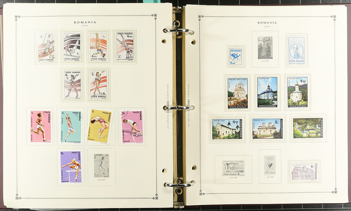 Collection of mint and used Romania, 1865-1994, containing over 1,000 stamps in over 100 album pages in a Uni-Safe binder with slipcase. The collection generally ranges from Scott #24/3893, along with selections of semi-postals and airmail issues. A spot check indicated a fairly even mixture of mint and used material, primarily from the 1900's to the 1980's, with some sets and souvenir sheets cataloguing $10 and up each. A nice collection that should be expanded further, overall fine to very fine. Estimate =