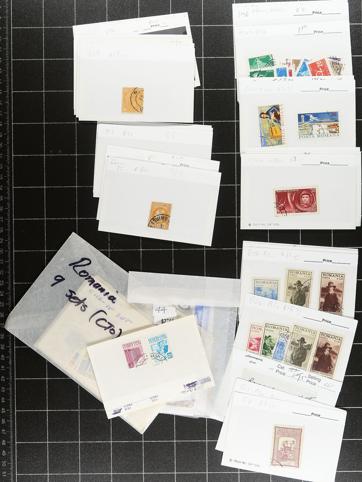 Accumulation of mint and used Romania, 1872-1996, containing roughly 1,300 stamps in a variety of formats including several 102 cards, and some stock and album pages. The lot generally ranges from Scott #85/2083, noting singles and sets, with the majority of material ranging from the 1920's to the 1970's. We note several topical and thematic subjects within, and ideal for all collectors. Overall fine to very fine. Owner's older 2012 Scott US$838.00 =