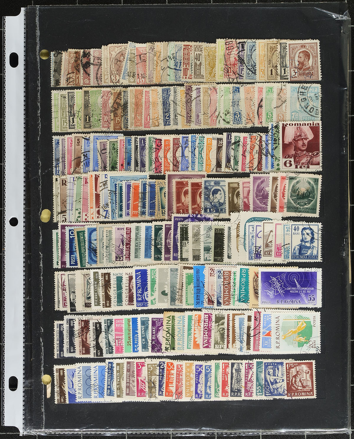 Accumulation of mint and used Romania, 1872-1996, containing roughly 1,300 stamps in a variety of formats including several 102 cards, and some stock and album pages. The lot generally ranges from Scott #85/2083, noting singles and sets, with the majority of material ranging from the 1920's to the 1970's. We note several topical and thematic subjects within, and ideal for all collectors. Overall fine to very fine. Owner's older 2012 Scott US$838.00 =