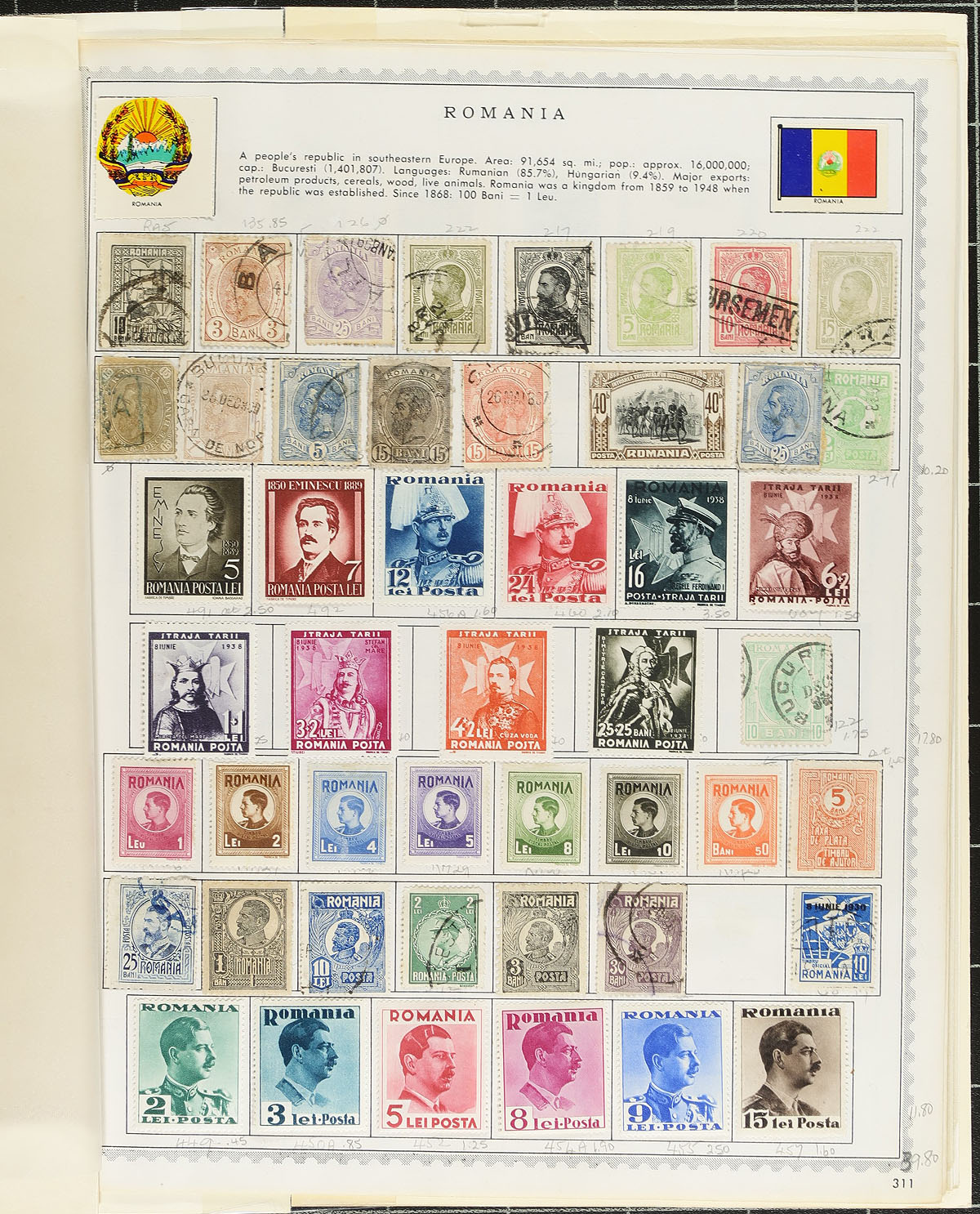 Accumulation of mint and used Romania, 1872-1996, containing roughly 1,300 stamps in a variety of formats including several 102 cards, and some stock and album pages. The lot generally ranges from Scott #85/2083, noting singles and sets, with the majority of material ranging from the 1920's to the 1970's. We note several topical and thematic subjects within, and ideal for all collectors. Overall fine to very fine. Owner's older 2012 Scott US$838.00 =