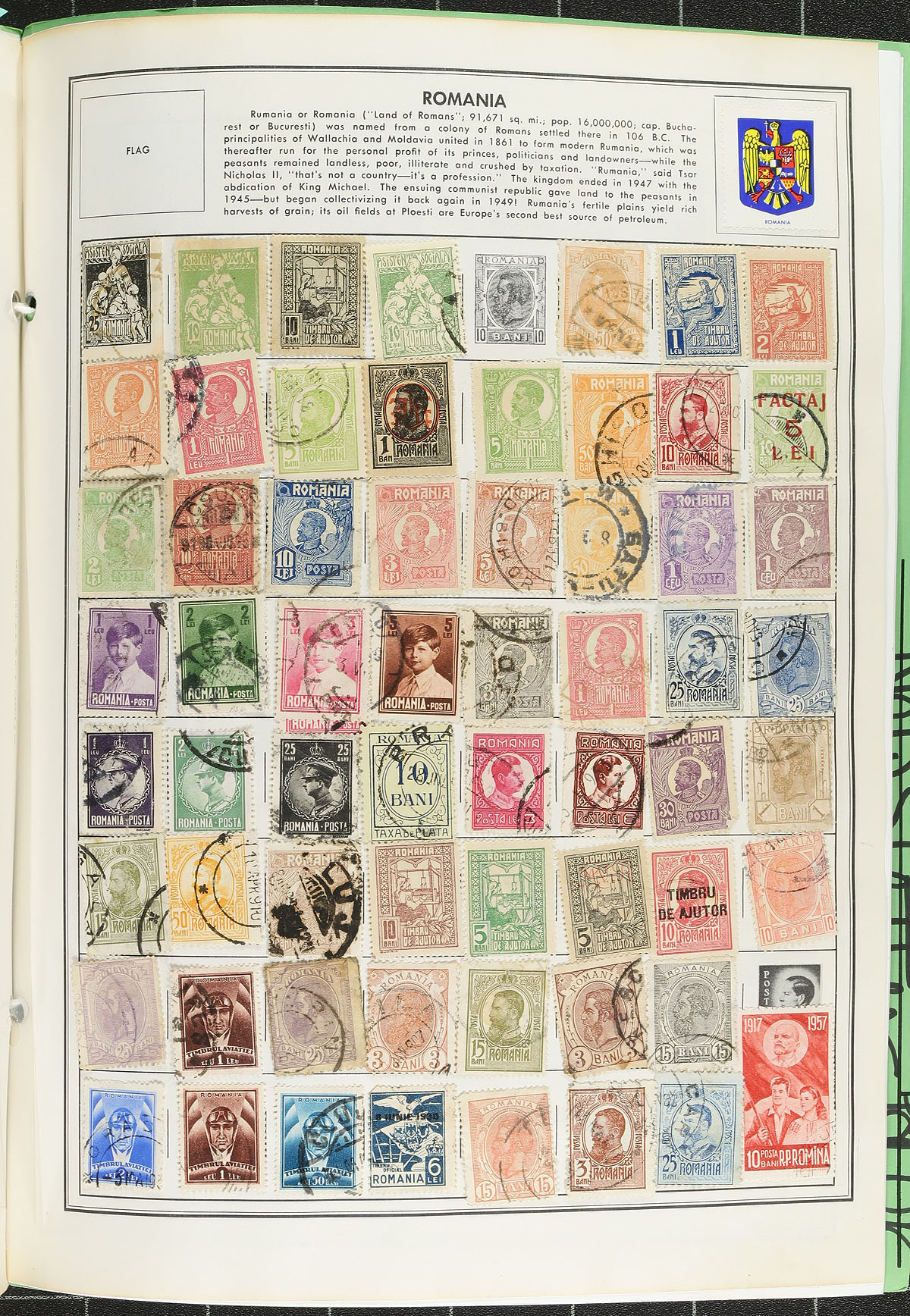 Accumulation of mint and used Romania, 1872-1996, containing roughly 1,300 stamps in a variety of formats including several 102 cards, and some stock and album pages. The lot generally ranges from Scott #85/2083, noting singles and sets, with the majority of material ranging from the 1920's to the 1970's. We note several topical and thematic subjects within, and ideal for all collectors. Overall fine to very fine. Owner's older 2012 Scott US$838.00 =