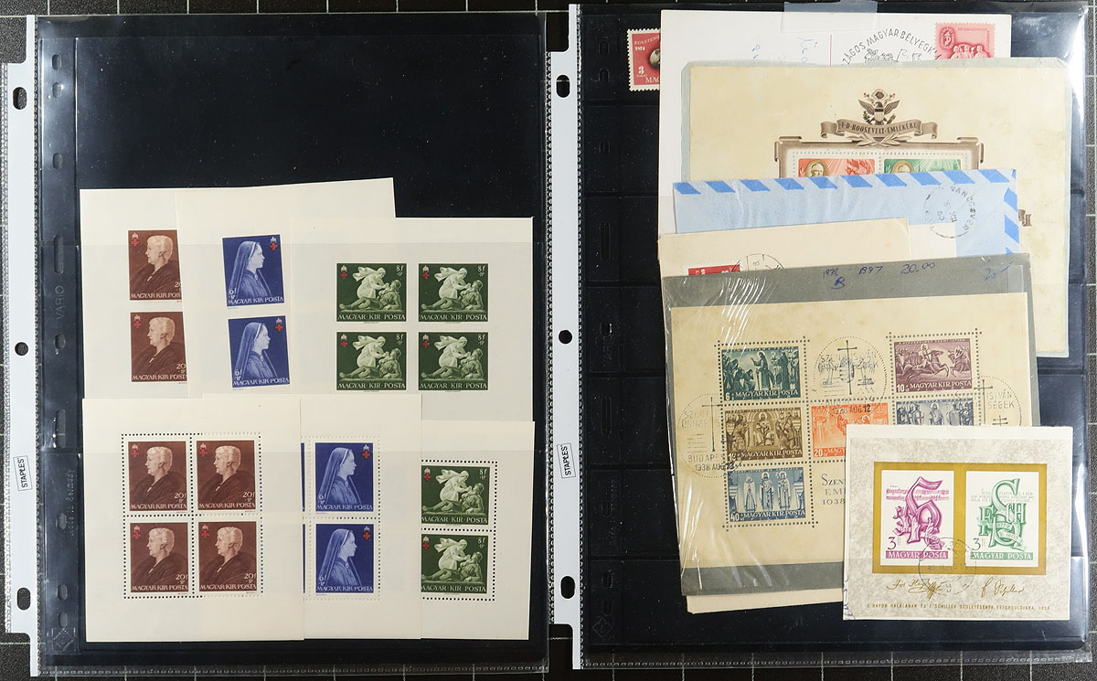 Group of roughly 130 primarily never hinged Hungary souvenir sheets, 1940's-1990's, in a handful of stock pages. A spot check indicates a nice selection of regular issues, along with semi-postals and airmails with catalogue value ranging from $3 to $8 for most sheets, but did spot #s 486 (lh, c.v. $62), B202 (lh, $42). Owner's older Scott catalogue value for the group is in excess of US$575.00. A nice lot for topical and thematic collectors as we noted a number of suitable subjects. Estimate =