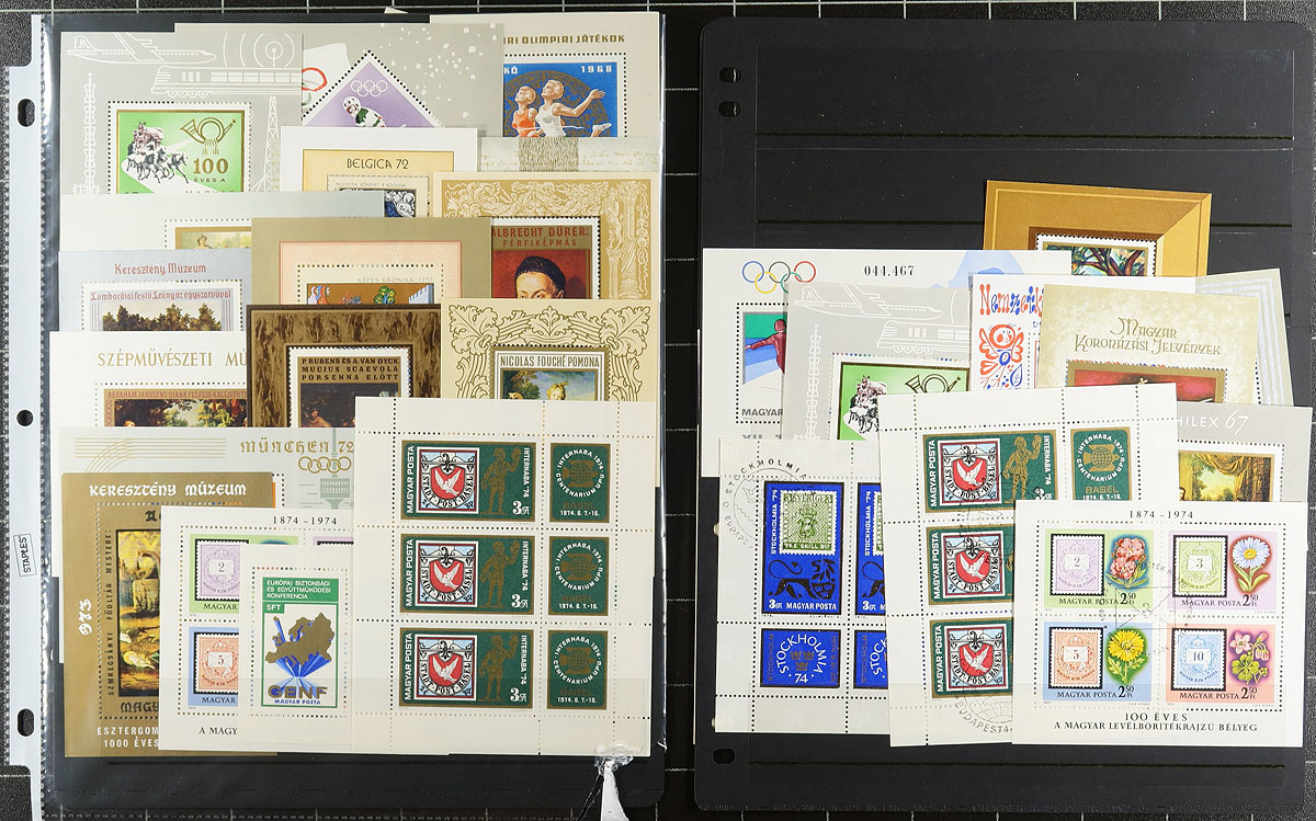Group of roughly 130 primarily never hinged Hungary souvenir sheets, 1940's-1990's, in a handful of stock pages. A spot check indicates a nice selection of regular issues, along with semi-postals and airmails with catalogue value ranging from $3 to $8 for most sheets, but did spot #s 486 (lh, c.v. $62), B202 (lh, $42). Owner's older Scott catalogue value for the group is in excess of US$575.00. A nice lot for topical and thematic collectors as we noted a number of suitable subjects. Estimate =