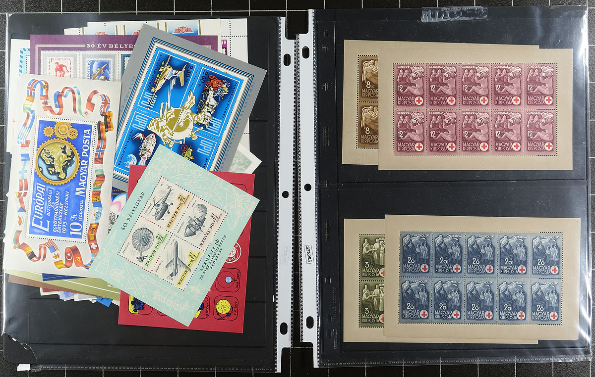 Group of roughly 130 primarily never hinged Hungary souvenir sheets, 1940's-1990's, in a handful of stock pages. A spot check indicates a nice selection of regular issues, along with semi-postals and airmails with catalogue value ranging from $3 to $8 for most sheets, but did spot #s 486 (lh, c.v. $62), B202 (lh, $42). Owner's older Scott catalogue value for the group is in excess of US$575.00. A nice lot for topical and thematic collectors as we noted a number of suitable subjects. Estimate =