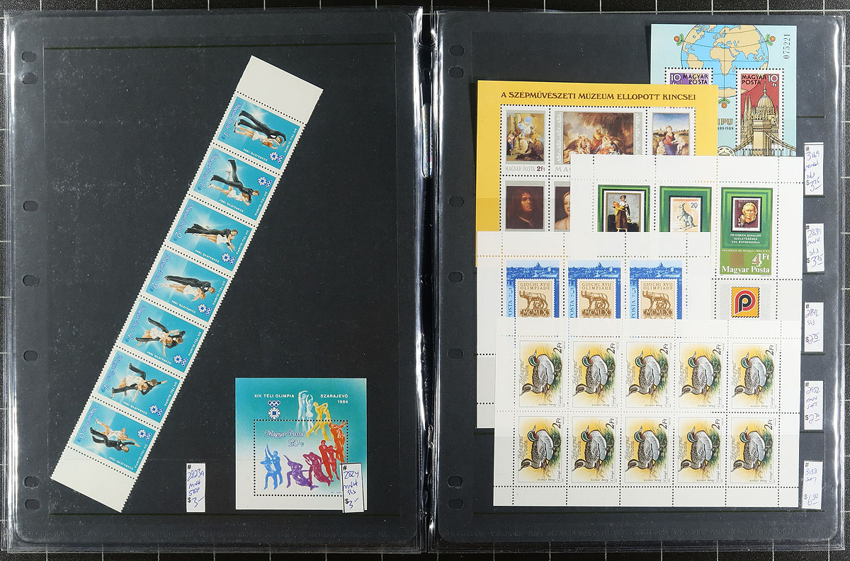 Group of roughly 130 primarily never hinged Hungary souvenir sheets, 1940's-1990's, in a handful of stock pages. A spot check indicates a nice selection of regular issues, along with semi-postals and airmails with catalogue value ranging from $3 to $8 for most sheets, but did spot #s 486 (lh, c.v. $62), B202 (lh, $42). Owner's older Scott catalogue value for the group is in excess of US$575.00. A nice lot for topical and thematic collectors as we noted a number of suitable subjects. Estimate =