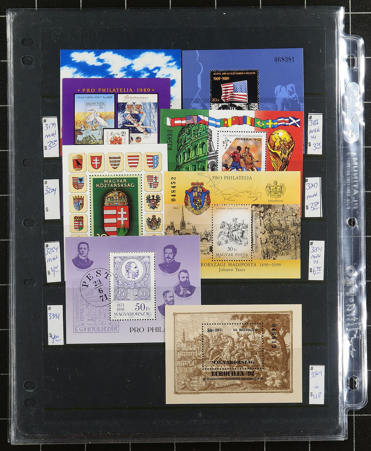 Group of roughly 130 primarily never hinged Hungary souvenir sheets, 1940's-1990's, in a handful of stock pages. A spot check indicates a nice selection of regular issues, along with semi-postals and airmails with catalogue value ranging from $3 to $8 for most sheets, but did spot #s 486 (lh, c.v. $62), B202 (lh, $42). Owner's older Scott catalogue value for the group is in excess of US$575.00. A nice lot for topical and thematic collectors as we noted a number of suitable subjects. Estimate =