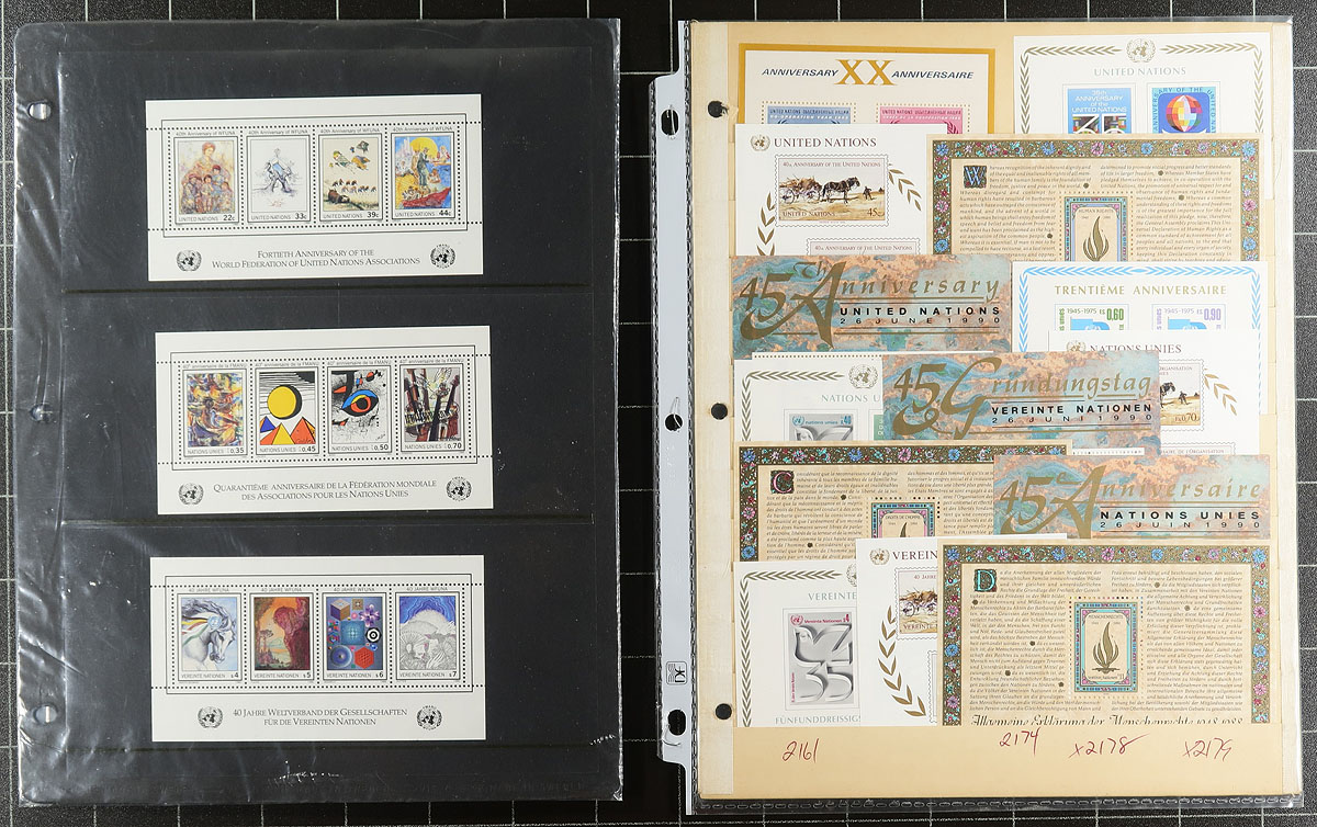 Accumulation of a few hundred primarily never hinged United Nations souvenir sheets and sheetlets, 1955-2001, including material from all three offices, noting a number of thematic and topical subjects including issues "Survival of the Forests", "Mission to Planet Earth", "Endangered Species", and more. Duplication ranges from 2 to 25 for a some sheets. Owner's older 2015 Scott US$1,803.00 =