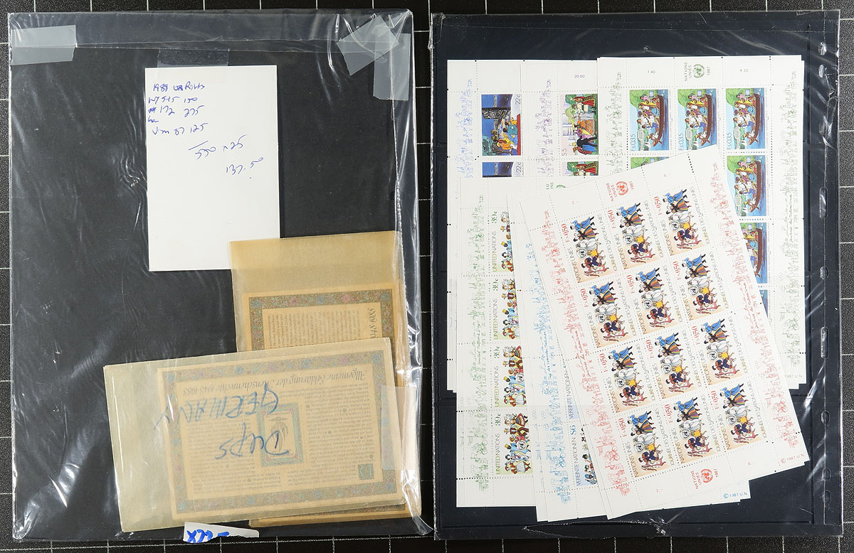 Accumulation of a few hundred primarily never hinged United Nations souvenir sheets and sheetlets, 1955-2001, including material from all three offices, noting a number of thematic and topical subjects including issues "Survival of the Forests", "Mission to Planet Earth", "Endangered Species", and more. Duplication ranges from 2 to 25 for a some sheets. Owner's older 2015 Scott US$1,803.00 =