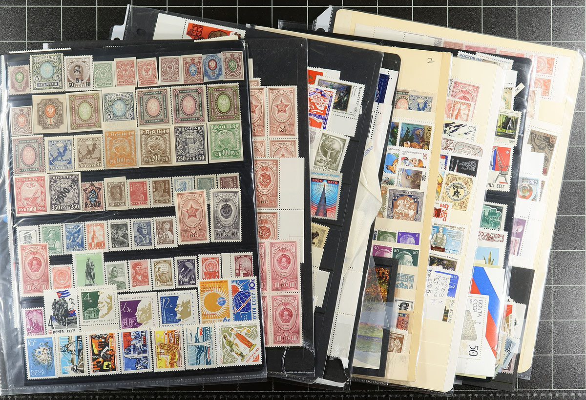 Collection / accumulation of mint Russia, 1909-2000, containing roughly 1,600 stamps in over 15 stock pages. This fairly organized lot generally ranges from Scott #74/6606i, including "back of the book" issues, blocks and multiples, and souvenir sheets, noting some singles, sets, and partial sets cataloguing $5 to $10 and up. Lots of potential finds to the dedicated collector. A nice clean lot, with many suitable topical and thematic subjects, ideal for all collectors. Owner's older 2013 Scott US$1,527.00 =