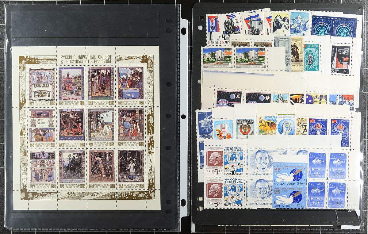 Collection / accumulation of mint Russia, 1909-2000, containing roughly 1,600 stamps in over 15 stock pages. This fairly organized lot generally ranges from Scott #74/6606i, including "back of the book" issues, blocks and multiples, and souvenir sheets, noting some singles, sets, and partial sets cataloguing $5 to $10 and up. Lots of potential finds to the dedicated collector. A nice clean lot, with many suitable topical and thematic subjects, ideal for all collectors. Owner's older 2013 Scott US$1,527.00 =