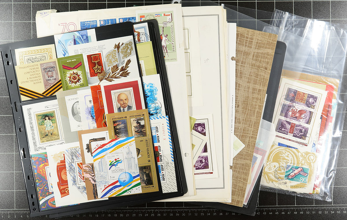 Group of roughly 275 mint and used Russia souvenir sheets, 1958-1998, many with CTO canceled hinged on album pages and in a handful of stock pages. A spot check indicated most sheets cataloguing $5 and under, but did spot #2106a set (c.v. $50), leaving other finds to collectors. A nice lot for topical and thematic collectors as we spotted several suitable subjects including sports, transportation, space, painters, and more. Should be worth our low estimate, overall fine to very fine. Estimate =