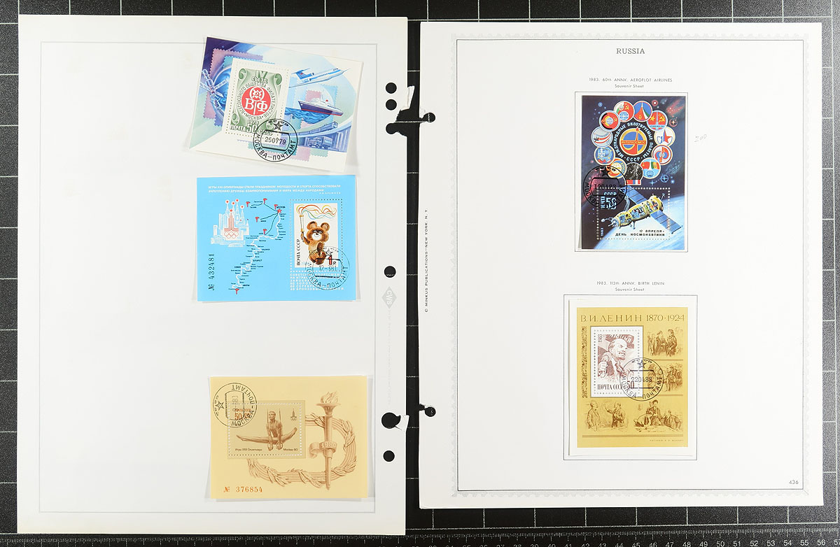 Group of roughly 275 mint and used Russia souvenir sheets, 1958-1998, many with CTO canceled hinged on album pages and in a handful of stock pages. A spot check indicated most sheets cataloguing $5 and under, but did spot #2106a set (c.v. $50), leaving other finds to collectors. A nice lot for topical and thematic collectors as we spotted several suitable subjects including sports, transportation, space, painters, and more. Should be worth our low estimate, overall fine to very fine. Estimate =