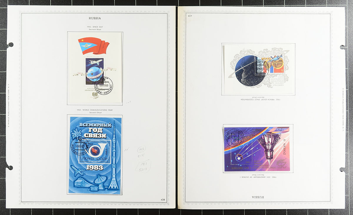 Group of roughly 275 mint and used Russia souvenir sheets, 1958-1998, many with CTO canceled hinged on album pages and in a handful of stock pages. A spot check indicated most sheets cataloguing $5 and under, but did spot #2106a set (c.v. $50), leaving other finds to collectors. A nice lot for topical and thematic collectors as we spotted several suitable subjects including sports, transportation, space, painters, and more. Should be worth our low estimate, overall fine to very fine. Estimate =