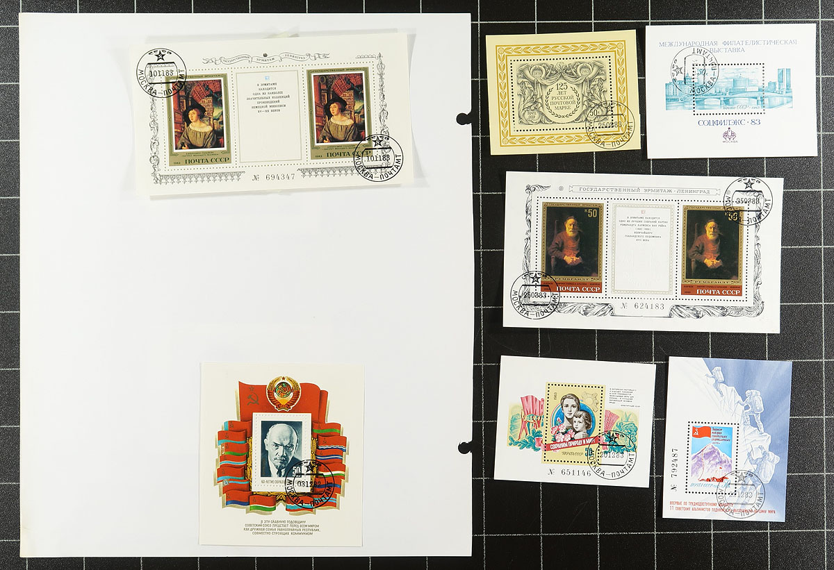Group of roughly 275 mint and used Russia souvenir sheets, 1958-1998, many with CTO canceled hinged on album pages and in a handful of stock pages. A spot check indicated most sheets cataloguing $5 and under, but did spot #2106a set (c.v. $50), leaving other finds to collectors. A nice lot for topical and thematic collectors as we spotted several suitable subjects including sports, transportation, space, painters, and more. Should be worth our low estimate, overall fine to very fine. Estimate =