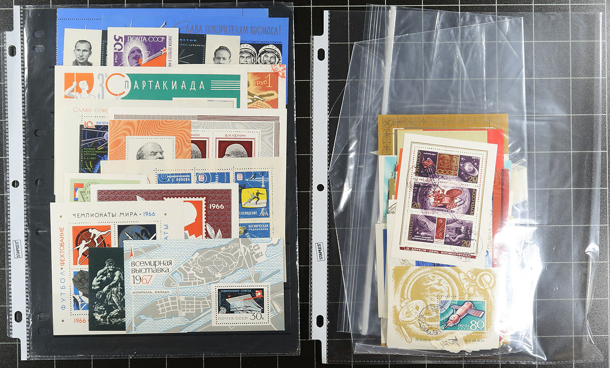 Group of roughly 275 mint and used Russia souvenir sheets, 1958-1998, many with CTO canceled hinged on album pages and in a handful of stock pages. A spot check indicated most sheets cataloguing $5 and under, but did spot #2106a set (c.v. $50), leaving other finds to collectors. A nice lot for topical and thematic collectors as we spotted several suitable subjects including sports, transportation, space, painters, and more. Should be worth our low estimate, overall fine to very fine. Estimate =
