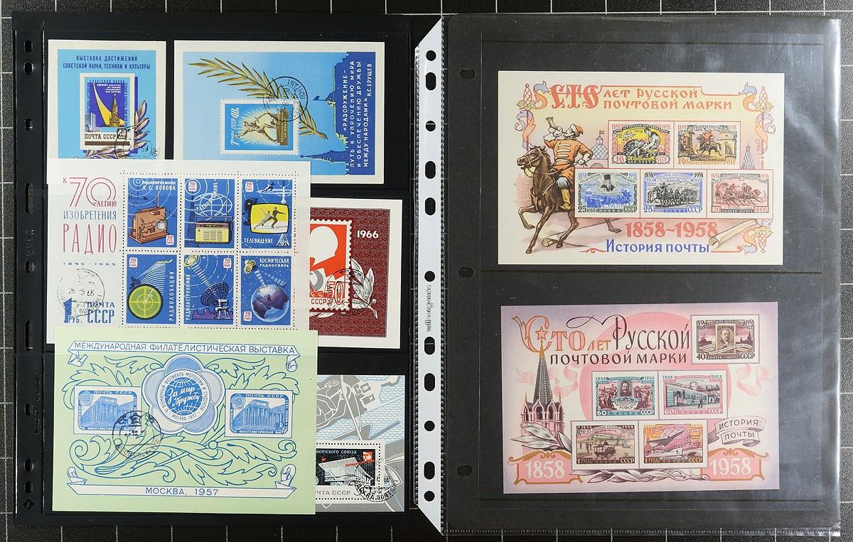 Group of roughly 275 mint and used Russia souvenir sheets, 1958-1998, many with CTO canceled hinged on album pages and in a handful of stock pages. A spot check indicated most sheets cataloguing $5 and under, but did spot #2106a set (c.v. $50), leaving other finds to collectors. A nice lot for topical and thematic collectors as we spotted several suitable subjects including sports, transportation, space, painters, and more. Should be worth our low estimate, overall fine to very fine. Estimate =