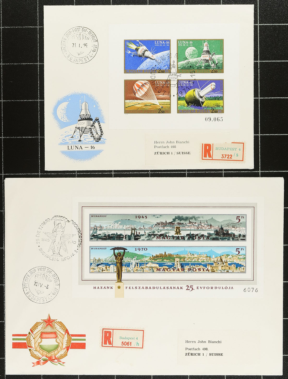 First Day Covers. Lovely group of roughly 130 Hungary first day covers, 1960's-1970's, noting singles, sets, and souvenir sheet frankings. The lot contains regular issues, along with semi-postals, and airmail first day covers, some having both the perforated and imperforate issues. A spot check indicates several imperforate sets and first day covers cataloguing $20 and up (counted as used stamps), including #s 1336 ($40), 1619-1625 ($60 total), C250 ($100), and more. A potentially high cataloguing lot, ideal for thematic and topical collectors as we saw music, cats, fish, painters, and other suitable subjects. Estimate =