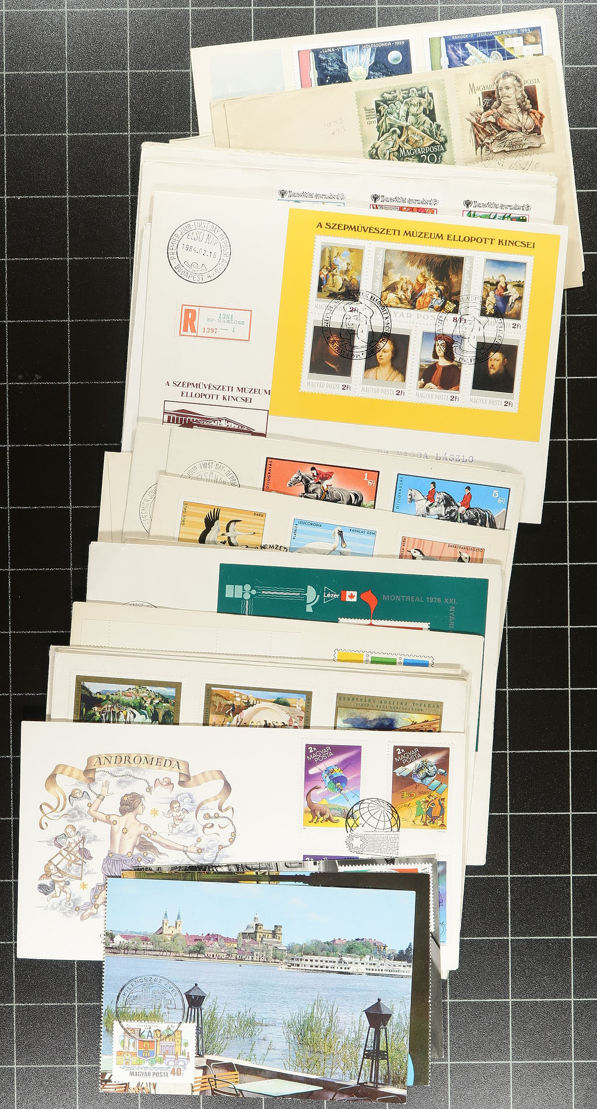 First Day Covers. Lovely group of roughly 130 Hungary first day covers, 1960's-1970's, noting singles, sets, and souvenir sheet frankings. The lot contains regular issues, along with semi-postals, and airmail first day covers, some having both the perforated and imperforate issues. A spot check indicates several imperforate sets and first day covers cataloguing $20 and up (counted as used stamps), including #s 1336 ($40), 1619-1625 ($60 total), C250 ($100), and more. A potentially high cataloguing lot, ideal for thematic and topical collectors as we saw music, cats, fish, painters, and other suitable subjects. Estimate =