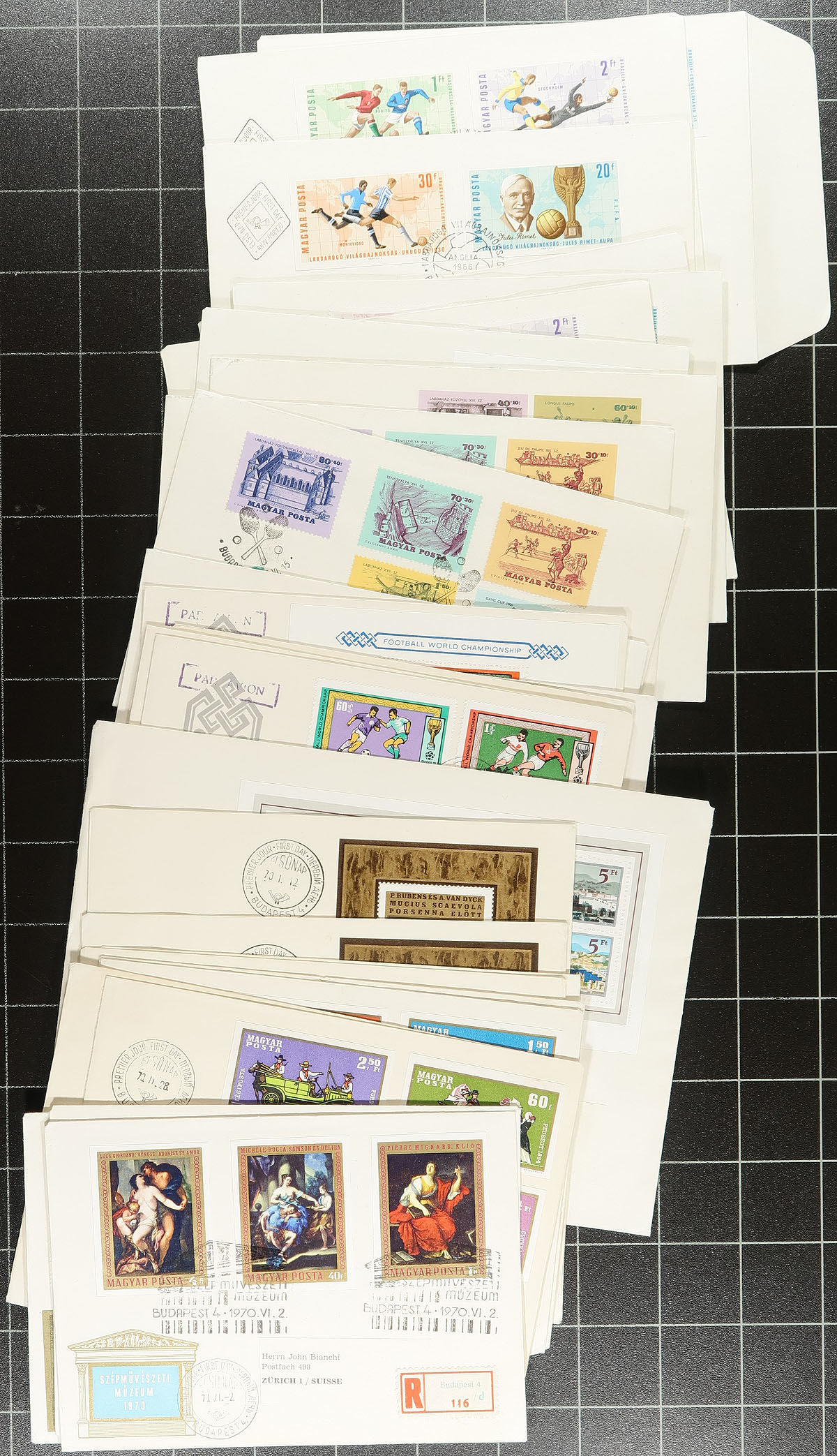 First Day Covers. Lovely group of roughly 130 Hungary first day covers, 1960's-1970's, noting singles, sets, and souvenir sheet frankings. The lot contains regular issues, along with semi-postals, and airmail first day covers, some having both the perforated and imperforate issues. A spot check indicates several imperforate sets and first day covers cataloguing $20 and up (counted as used stamps), including #s 1336 ($40), 1619-1625 ($60 total), C250 ($100), and more. A potentially high cataloguing lot, ideal for thematic and topical collectors as we saw music, cats, fish, painters, and other suitable subjects. Estimate =