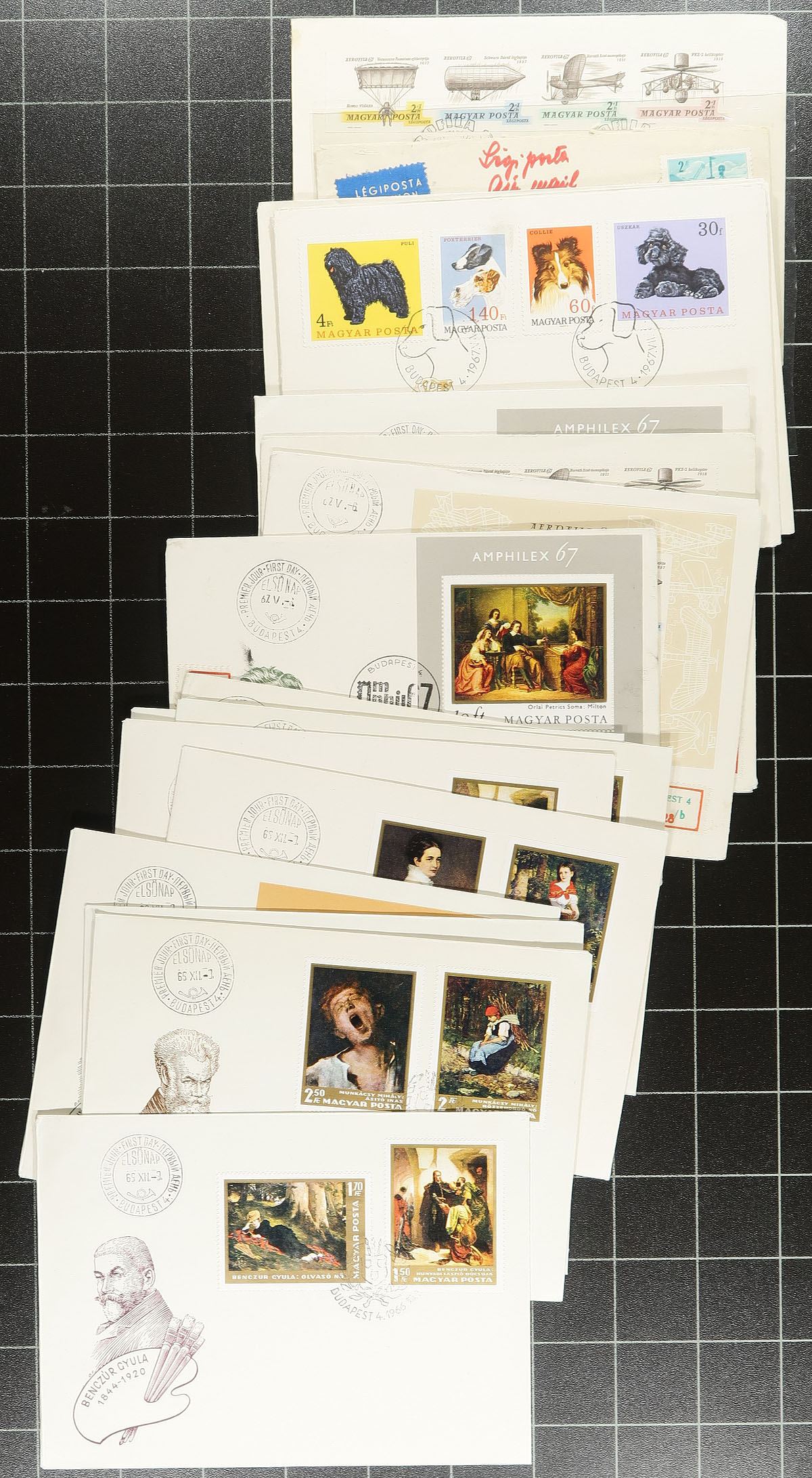 First Day Covers. Lovely group of roughly 130 Hungary first day covers, 1960's-1970's, noting singles, sets, and souvenir sheet frankings. The lot contains regular issues, along with semi-postals, and airmail first day covers, some having both the perforated and imperforate issues. A spot check indicates several imperforate sets and first day covers cataloguing $20 and up (counted as used stamps), including #s 1336 ($40), 1619-1625 ($60 total), C250 ($100), and more. A potentially high cataloguing lot, ideal for thematic and topical collectors as we saw music, cats, fish, painters, and other suitable subjects. Estimate =
