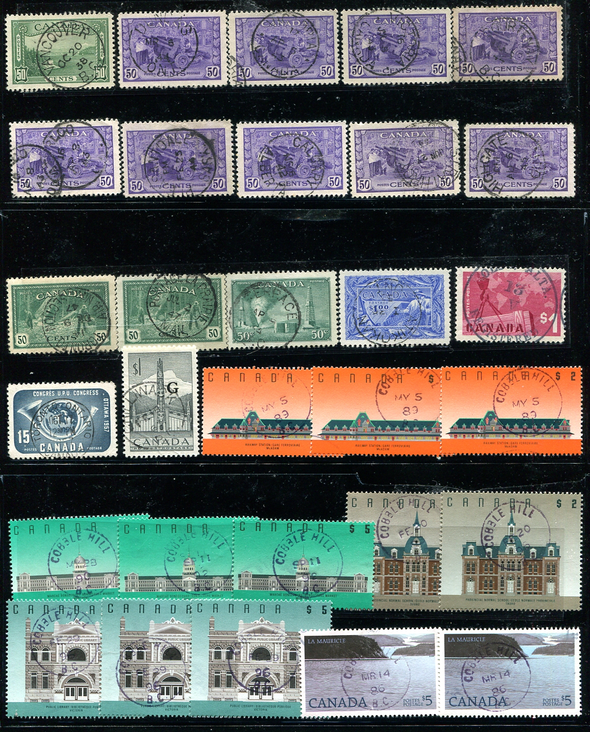 Selection of 60 better values all with "socked-on-the-nose" CDS cancels. A rare treat, with stamps ranging from 1908-1996. One clipped perfs noted on #201, one straight edge on #176, otherwise sound examples. Catalogued at lowest 2025-2026 Unitrade value. Unitrade =