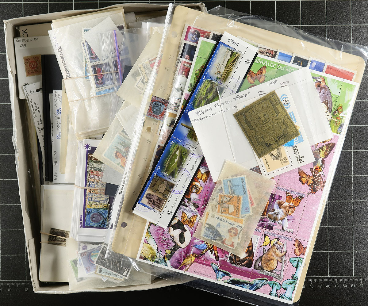 Treasure Box loaded with goodies as received from England, including much mint from tiny places like Marshall Islands; Germany excellent reprints (with provenance) of zeppelin air mails & early high values; USA plate number coils with checklist; 7 better used Kuwait cat. US$106.50; interesting Cinderella stamps; 92 different GB Millennium used stamps; some recent Falkland Islands used; Canada Millennium complete used set of 68 Unitrade $102.00; USA 1992 Columbus set souvenir sheets NH in original package Face US$16.34; Canada "Flying Postal Truck" stamp used issued during COVID and ONLY to postal employees; etc. 2+ pounds of good stuff! Estimate =