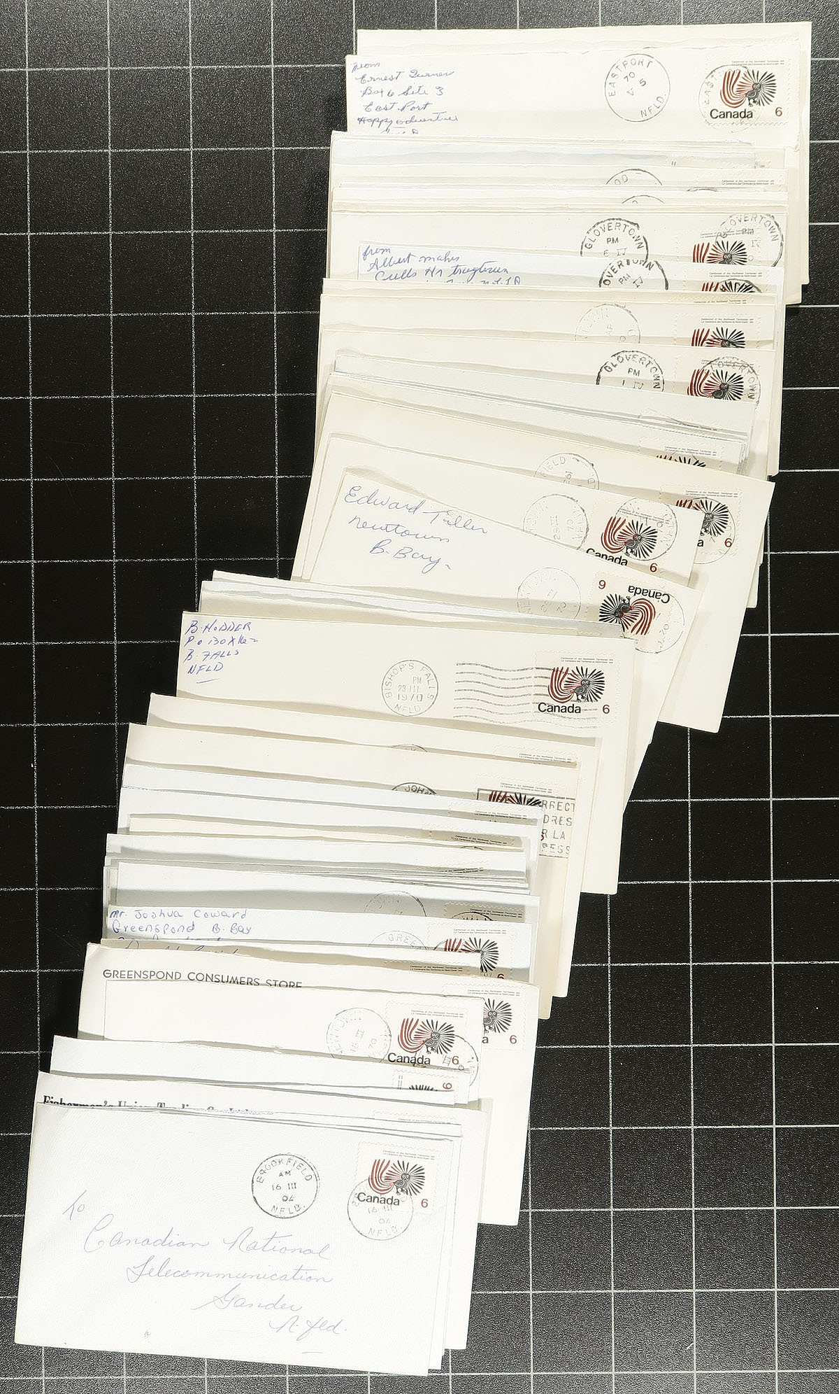 Group of roughly 500 covers collected for Newfoundland postmarks, all appearing to be from 1970, with roughly half of the covers franked with Scott #505 (Manitoba Centennial), or #506 (Northwest Territories Centennial). All the covers are commercial in nature, sent to offices in Gander, Newfoundland, from a variety of towns including Frederickton, Traytown, Indian Bay, Hare Bay B.B., Heart's Delight, Happy Valley, and more. Postmark interest includes cds, split ring, MOON, and more. Some covers have bends and other small faults, still a nice lot for the postmark hunter. Estimate =