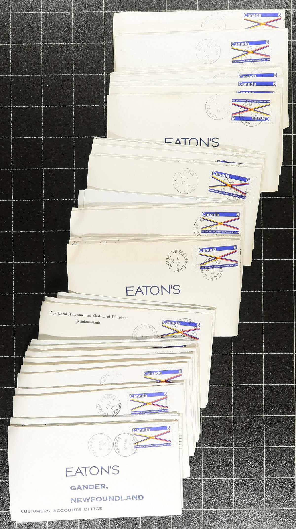 Group of roughly 500 covers collected for Newfoundland postmarks, all appearing to be from 1970, with roughly half of the covers franked with Scott #505 (Manitoba Centennial), or #506 (Northwest Territories Centennial). All the covers are commercial in nature, sent to offices in Gander, Newfoundland, from a variety of towns including Frederickton, Traytown, Indian Bay, Hare Bay B.B., Heart's Delight, Happy Valley, and more. Postmark interest includes cds, split ring, MOON, and more. Some covers have bends and other small faults, still a nice lot for the postmark hunter. Estimate =
