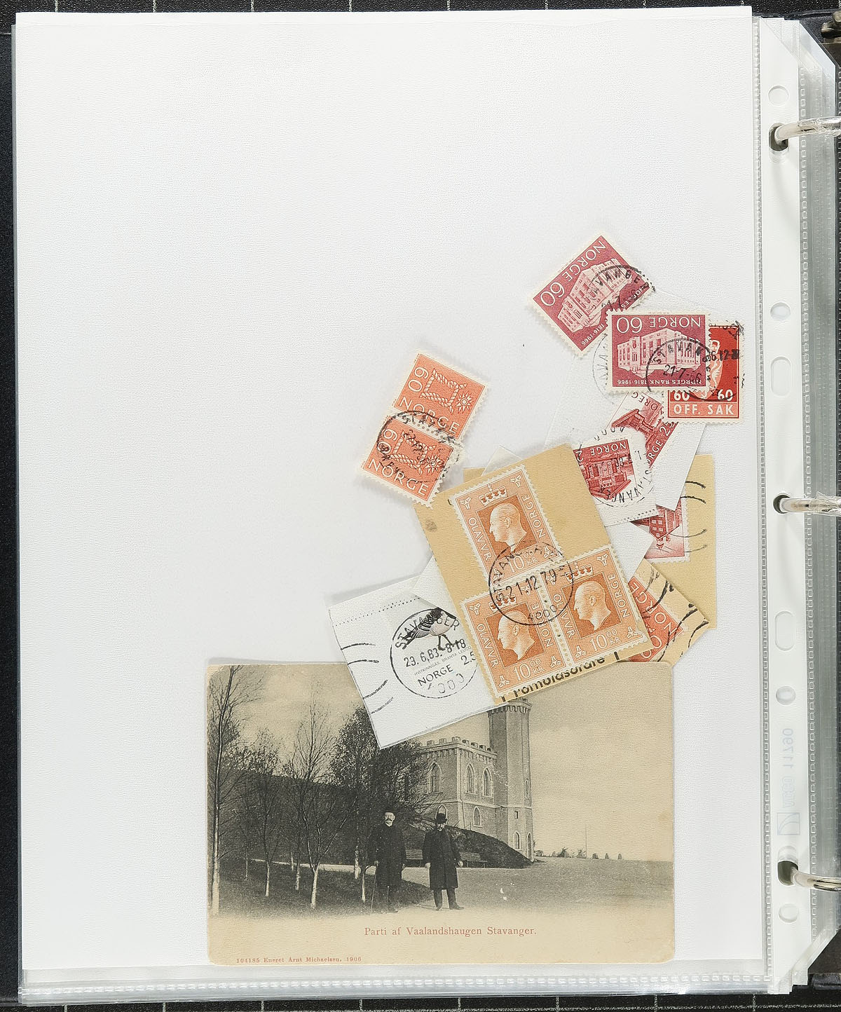 Specialized collection of Norway collected for town postmarks, 1960's-1990's, containing a few hundred stamps (mostly on piece), and roughly 100 covers on many homemade pages housed in a thick binder. The collection contains over 60 different towns ranging from S to Y (with at least one stamp representing each town), including Sandane, Sandefjord, Skeid, Tromsdalen,Vadso, Vanse, Ytre Laksevag, and much more. Postmark interest includes cds types, machine, slogan, including several "socked on the nose" town cancels. A nice lot for the postmark hunter, with online photos showing a sampling. Estimate =