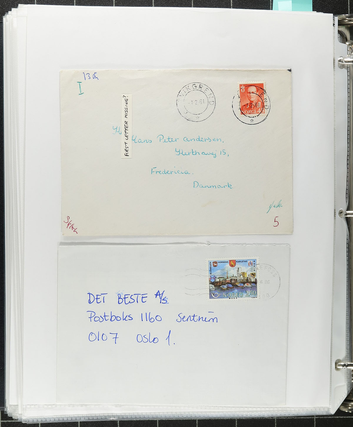Specialized collection of Norway collected for town postmarks, 1960's-1990's, containing a few hundred stamps (mostly on piece), and roughly 100 covers on many homemade pages housed in a thick binder. The collection contains over 60 different towns ranging from S to Y (with at least one stamp representing each town), including Sandane, Sandefjord, Skeid, Tromsdalen,Vadso, Vanse, Ytre Laksevag, and much more. Postmark interest includes cds types, machine, slogan, including several "socked on the nose" town cancels. A nice lot for the postmark hunter, with online photos showing a sampling. Estimate =