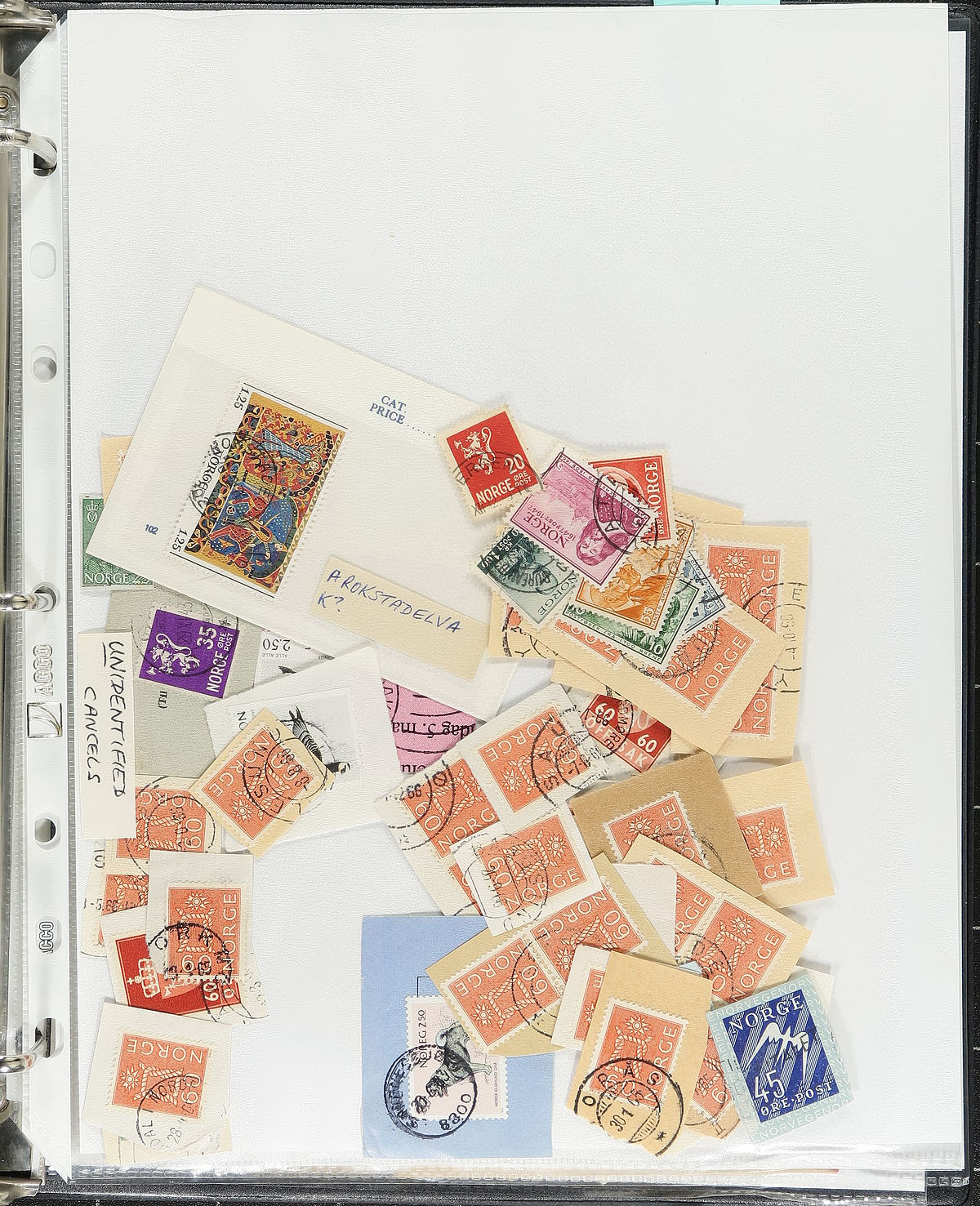 Specialized collection of Norway collected for town postmarks, 1960's-1990's, containing a few hundred stamps (mostly on piece), and roughly 100 covers on many homemade pages housed in a thick binder. The collection contains over 60 different towns ranging from S to Y (with at least one stamp representing each town), including Sandane, Sandefjord, Skeid, Tromsdalen,Vadso, Vanse, Ytre Laksevag, and much more. Postmark interest includes cds types, machine, slogan, including several "socked on the nose" town cancels. A nice lot for the postmark hunter, with online photos showing a sampling. Estimate =