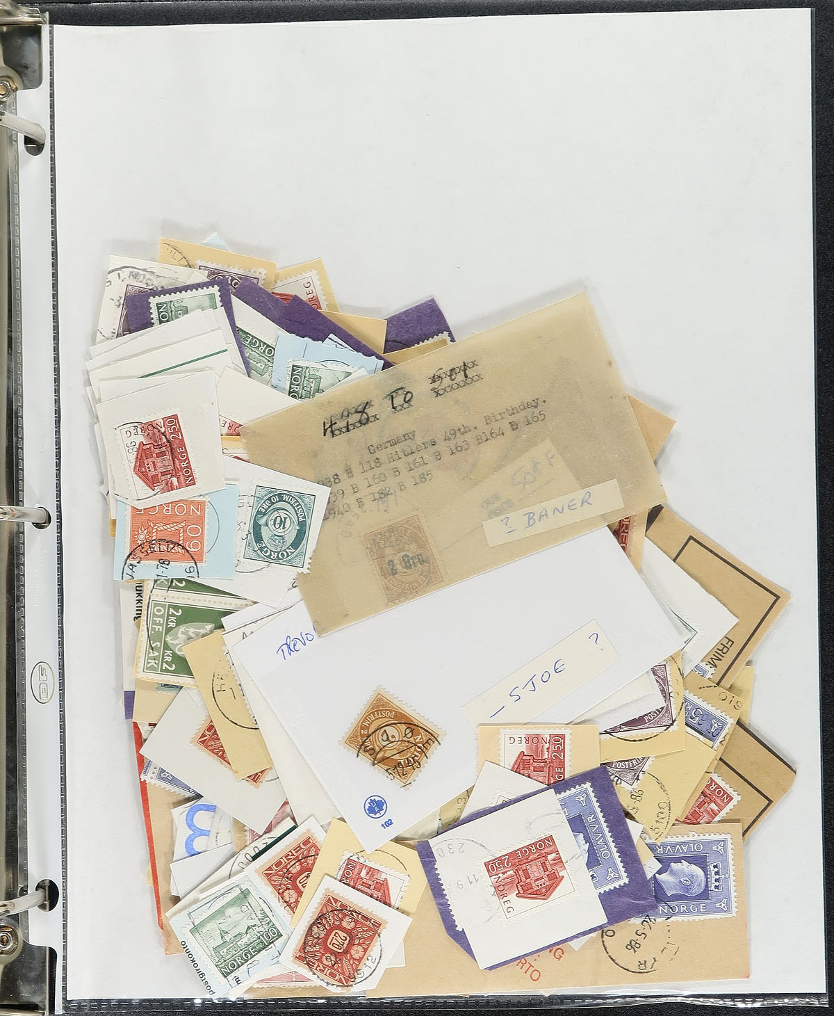 Specialized collection of Norway collected for town postmarks, 1960's-1990's, containing a few hundred stamps (mostly on piece), and roughly 100 covers on many homemade pages housed in a thick binder. The collection contains over 60 different towns ranging from S to Y (with at least one stamp representing each town), including Sandane, Sandefjord, Skeid, Tromsdalen,Vadso, Vanse, Ytre Laksevag, and much more. Postmark interest includes cds types, machine, slogan, including several "socked on the nose" town cancels. A nice lot for the postmark hunter, with online photos showing a sampling. Estimate =