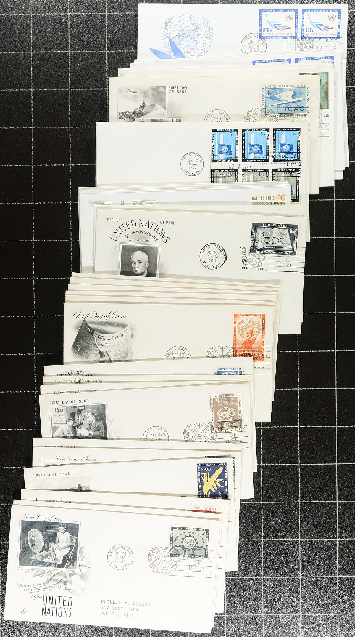 Large accumulation of United Nations covers, 1950's-2000's, containing mostly loose covers and 3 cover albums, filling a bankers box. The lot contains primarily first day covers with singles, blocks, sets, and souvenir sheet frankings, along with postal stationery, emergency covers, and more. A number of suitable thematic and topical frankings, and ideal for all collectors, especially at our low estimate. Estimate =