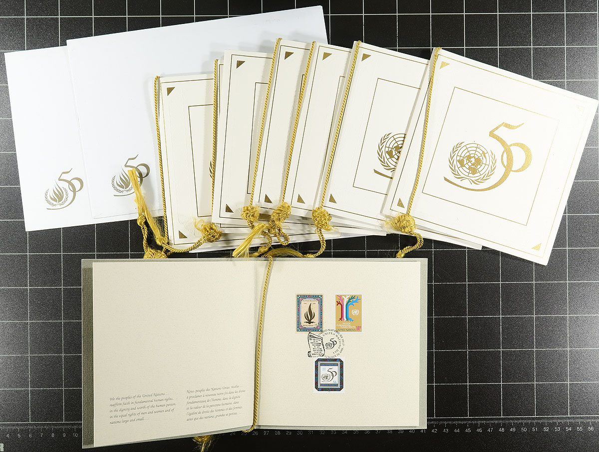 Large accumulation of United Nations covers, 1950's-2000's, containing mostly loose covers and 3 cover albums, filling a bankers box. The lot contains primarily first day covers with singles, blocks, sets, and souvenir sheet frankings, along with postal stationery, emergency covers, and more. A number of suitable thematic and topical frankings, and ideal for all collectors, especially at our low estimate. Estimate =