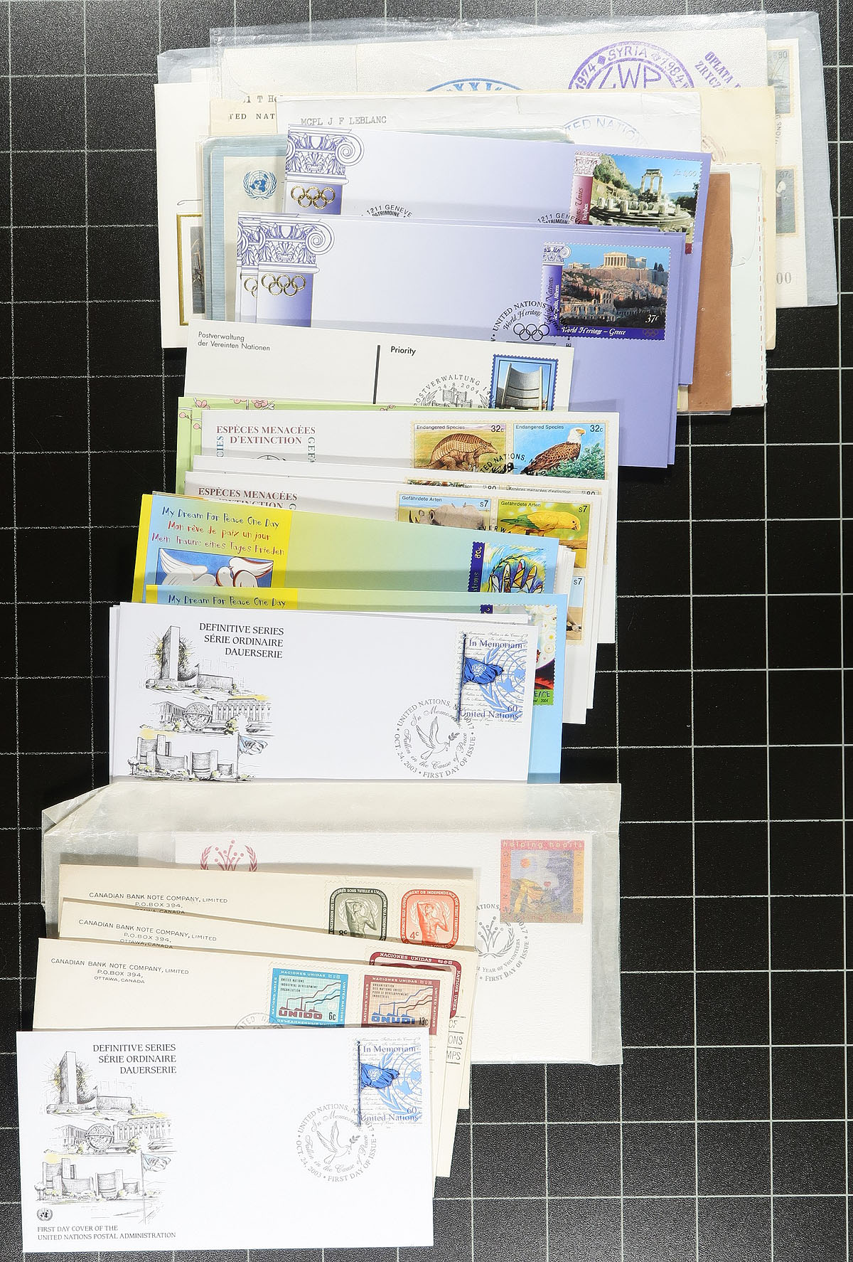 Large accumulation of United Nations covers, 1950's-2000's, containing mostly loose covers and 3 cover albums, filling a bankers box. The lot contains primarily first day covers with singles, blocks, sets, and souvenir sheet frankings, along with postal stationery, emergency covers, and more. A number of suitable thematic and topical frankings, and ideal for all collectors, especially at our low estimate. Estimate =