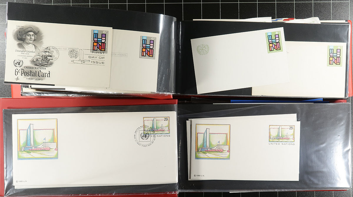 Large accumulation of United Nations covers, 1950's-2000's, containing mostly loose covers and 3 cover albums, filling a bankers box. The lot contains primarily first day covers with singles, blocks, sets, and souvenir sheet frankings, along with postal stationery, emergency covers, and more. A number of suitable thematic and topical frankings, and ideal for all collectors, especially at our low estimate. Estimate =