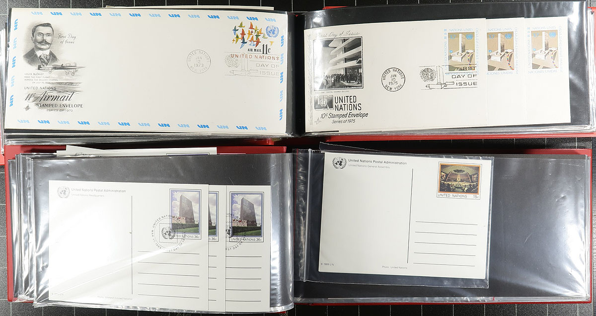 Large accumulation of United Nations covers, 1950's-2000's, containing mostly loose covers and 3 cover albums, filling a bankers box. The lot contains primarily first day covers with singles, blocks, sets, and souvenir sheet frankings, along with postal stationery, emergency covers, and more. A number of suitable thematic and topical frankings, and ideal for all collectors, especially at our low estimate. Estimate =