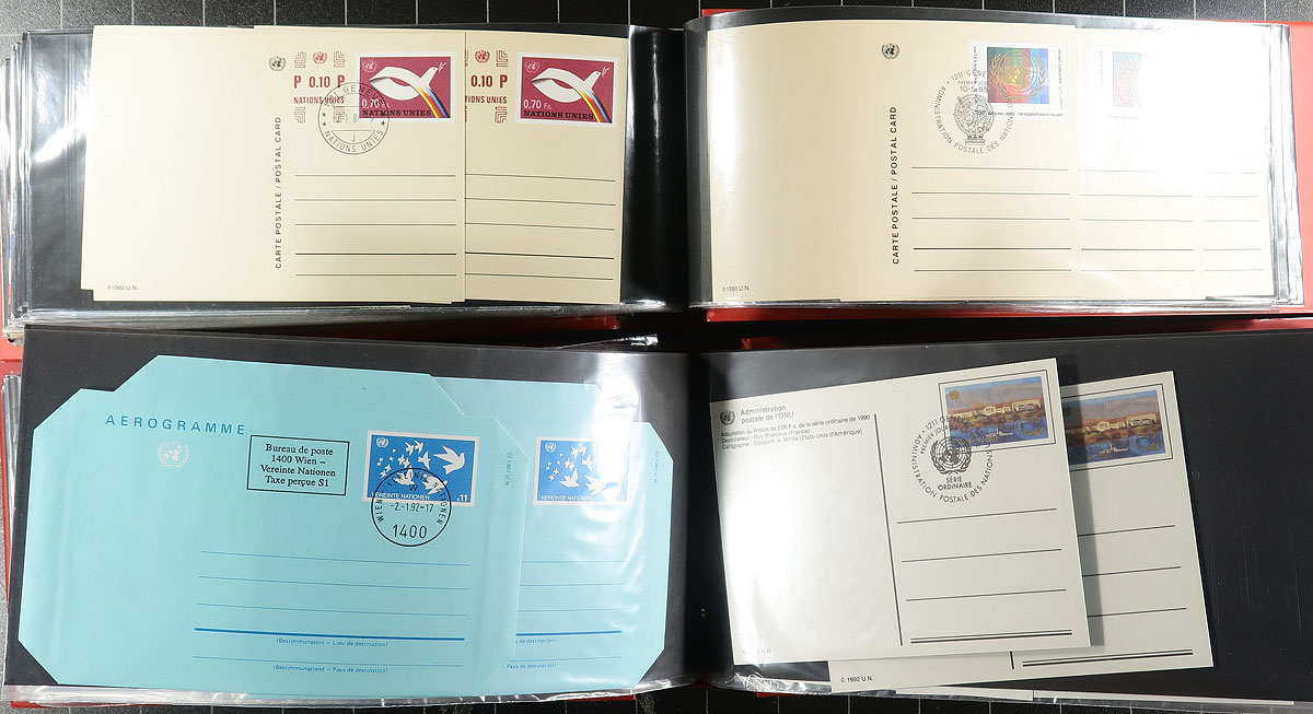 Large accumulation of United Nations covers, 1950's-2000's, containing mostly loose covers and 3 cover albums, filling a bankers box. The lot contains primarily first day covers with singles, blocks, sets, and souvenir sheet frankings, along with postal stationery, emergency covers, and more. A number of suitable thematic and topical frankings, and ideal for all collectors, especially at our low estimate. Estimate =
