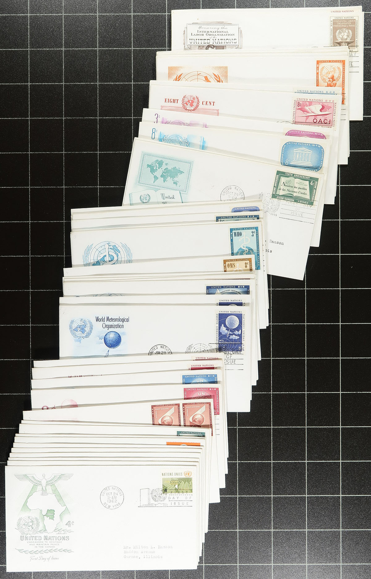 Large accumulation of United Nations covers, 1950's-2000's, containing mostly loose covers and 3 cover albums, filling a bankers box. The lot contains primarily first day covers with singles, blocks, sets, and souvenir sheet frankings, along with postal stationery, emergency covers, and more. A number of suitable thematic and topical frankings, and ideal for all collectors, especially at our low estimate. Estimate =